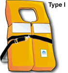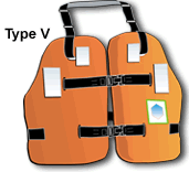 New federally mandated labeling of wearable PFDs may be found on newer personal flotation devices. The new labeling will show a performance level icon, such as 50, 70, 100 or 150. These are approved for the U.S. and Canada, whereas devices with the old labels (Type I - V) continue to be approved for one country or the other, not both.